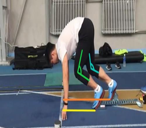 黄色线为前起跑器距离,橙色线为后起跑器距离,绿色角为预备时前置腿膝关节角度,蓝色角为后置腿膝关节角度 | 视频截图