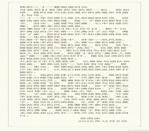 今天上午,被誉为“亚洲飞人”的男子100米亚洲纪录保持者、短跑名将苏炳添,通过社交媒体发表长文《我的二十一载跑道时光》,正式宣布退役。